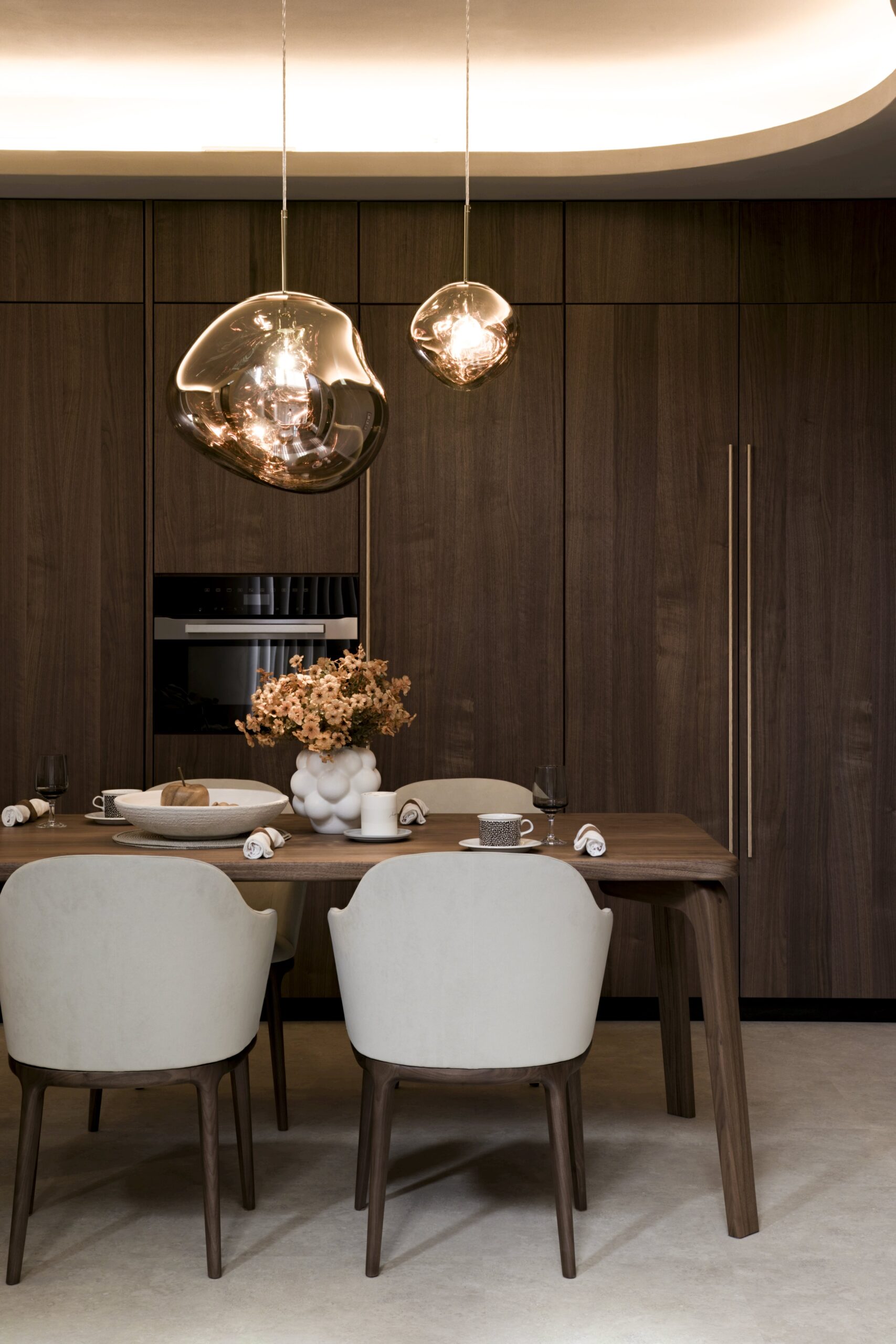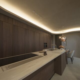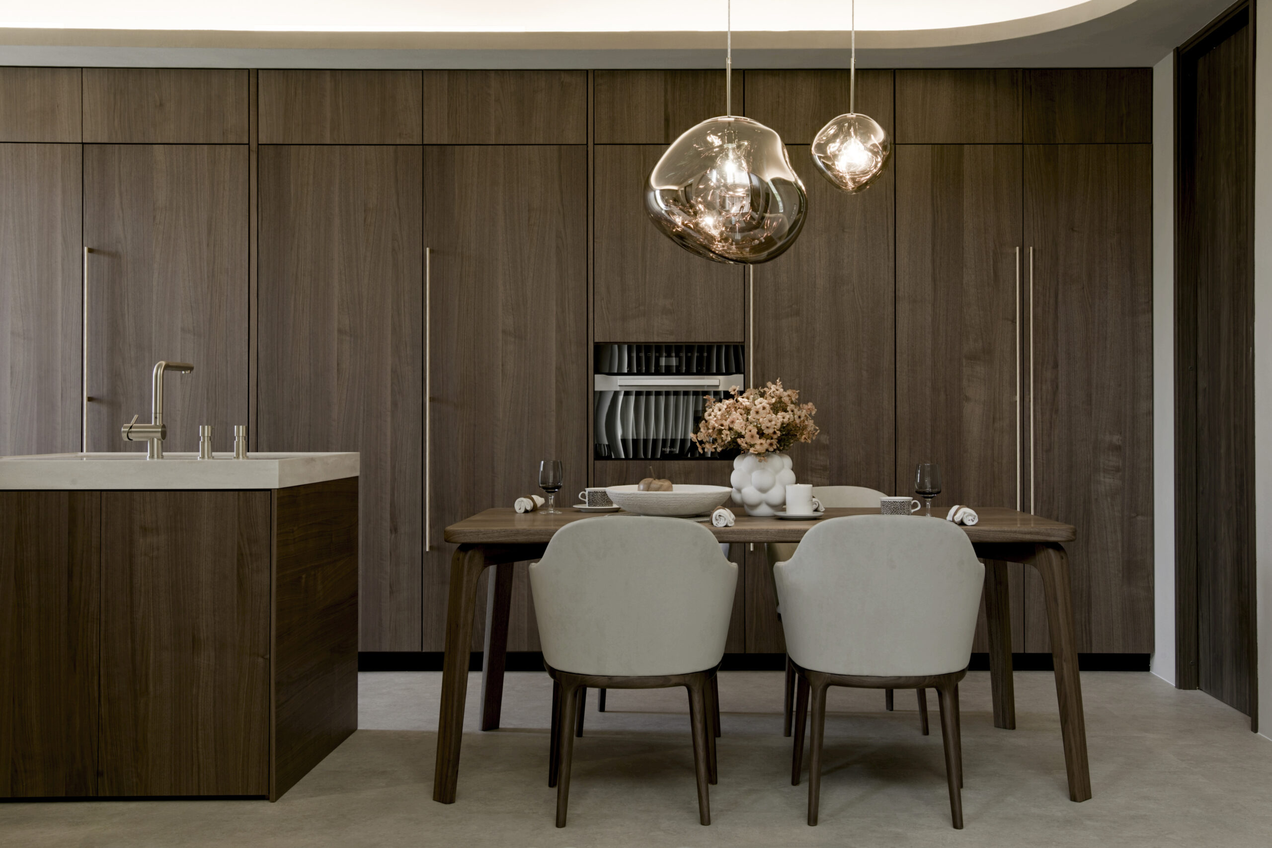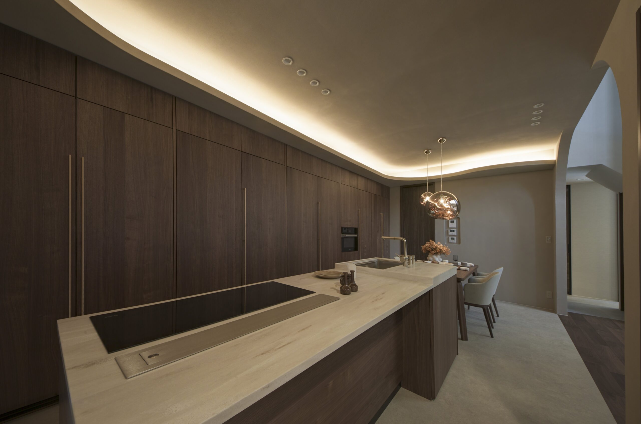 ・ウォールナットのキッチン(背面一面のウォールナット収納)