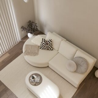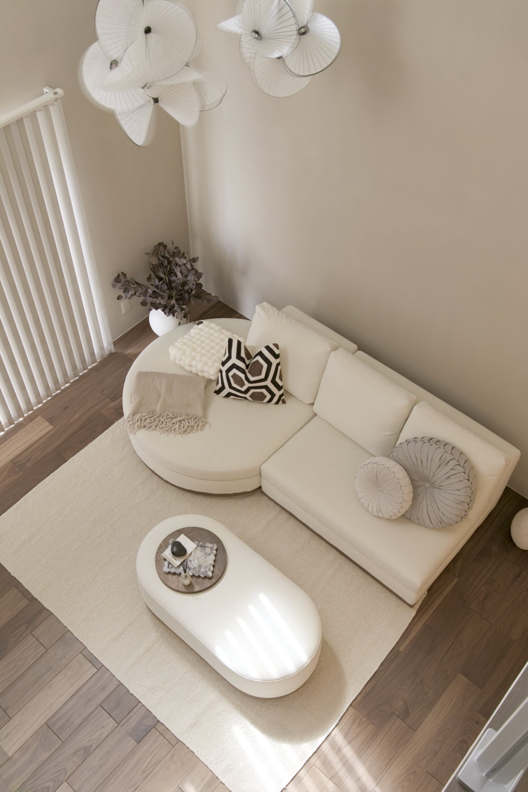・ローソファ+ラウンドオットマンで角をなくし、安心感のある重心設計